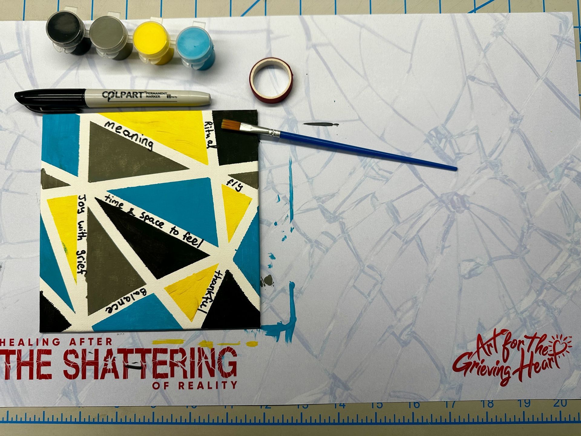 Park Memorial was invited to facilitate one of our Art for the Grieving Heart events for a group of Stollery parents and caregivers recently. We were asked to focus our grief discussion on the grief experienced because of all of the changes to the life and future that a family has imagined after a child’s diagnosis. Our art facilitator, Alexandra created the perfect art project: abstract canvases with shapes subdivided by washi tape and filled in with different colours of paint. Once the paint had dried, the tape was removed, and the words and expressions that had come to the hearts and minds of each guest as we journeyed through both written and discussion exercises found their way onto the canvases. Our discussion and writing exercises were gentle and thought-provoking, and centred on some writings of poet Ullie Kaye.