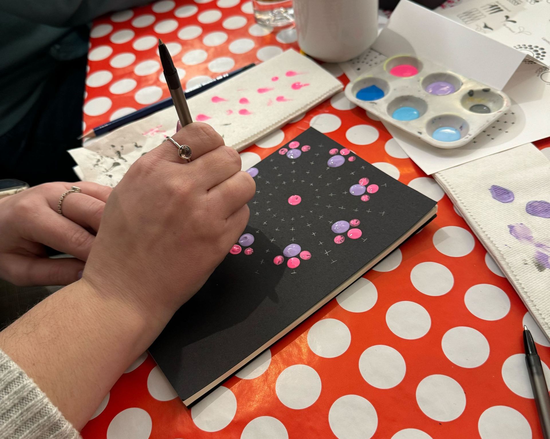 The art project at our February 2025 event was creating beautiful dot mandalas on paperback journal books. Our focus was on 'repeating simple tasks with care' not only in the art project, but also as an approach to the overwhelming road of grief.