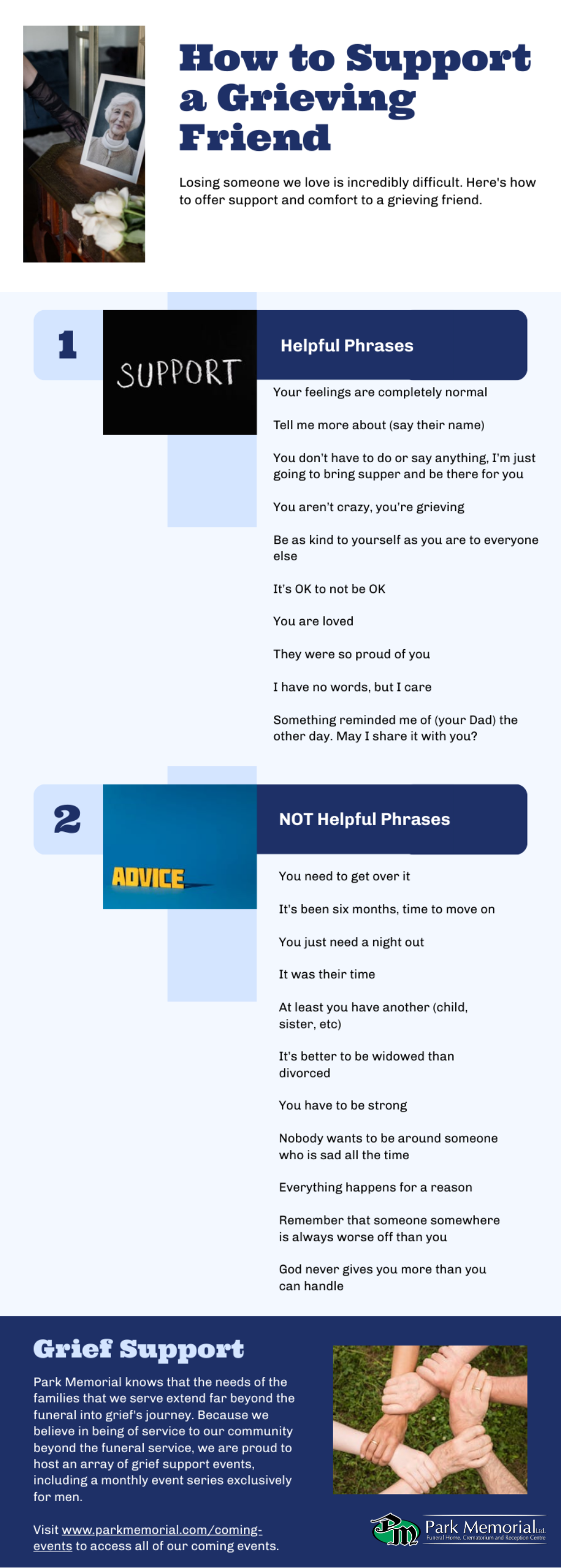 One of the points that is made in the above graphic is that your friend’s grief is theirs, not yours. It is not the time for you to share your own grief story, or place judgement on their grieving process with reference to your own grief and loss experiences… you are merely a vessel of acknowledgement and comfort.